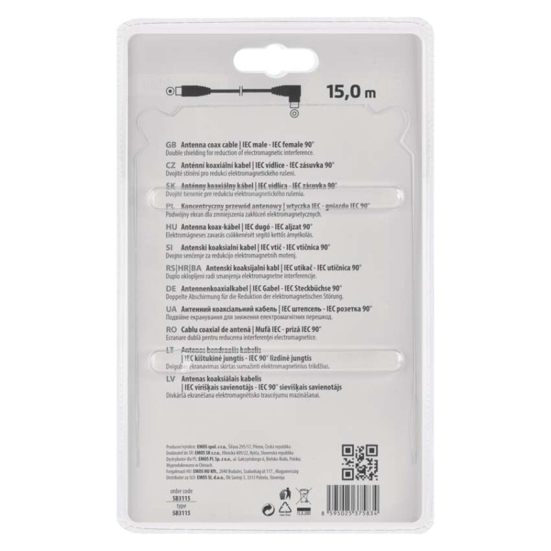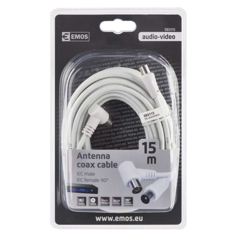 Anténny koaxiálny kábel s vidlicou a zásuvkou IEC. Kábel má uhlový konektor (90°). Kábel má dvojité tienenie pre redukciu elektromagnetického rušenia. Dĺžka kábla je 15 m. Koaxiálny kábel je vhodný pre SAT, DVB-T, ANT, DECODER, FLAT TV a TV.