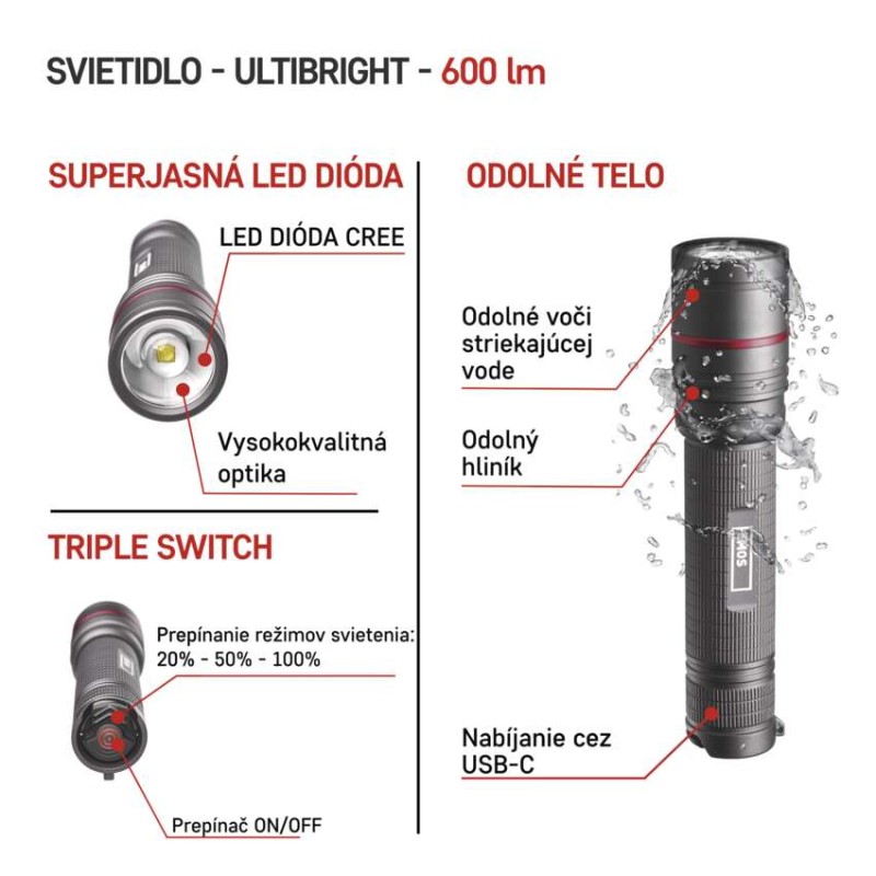 svetelný tok | CREE LED 100 % – 600 lm, CREE LED 50 % – 300 lm, CREE LED 20 % – 130 lm |