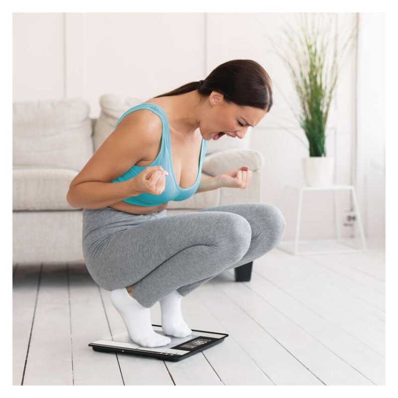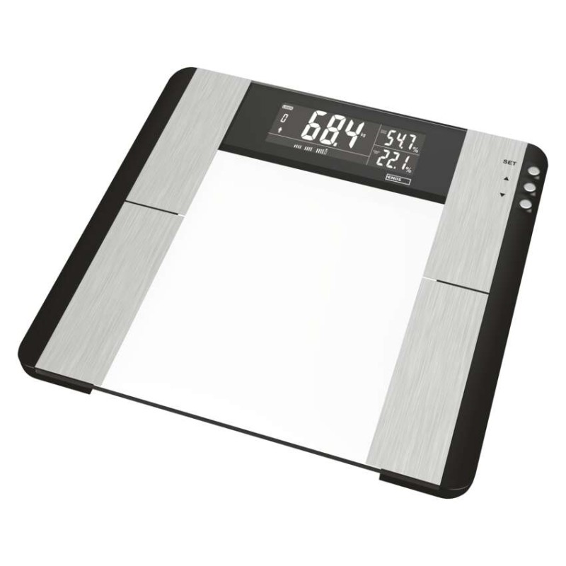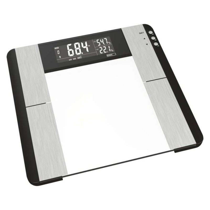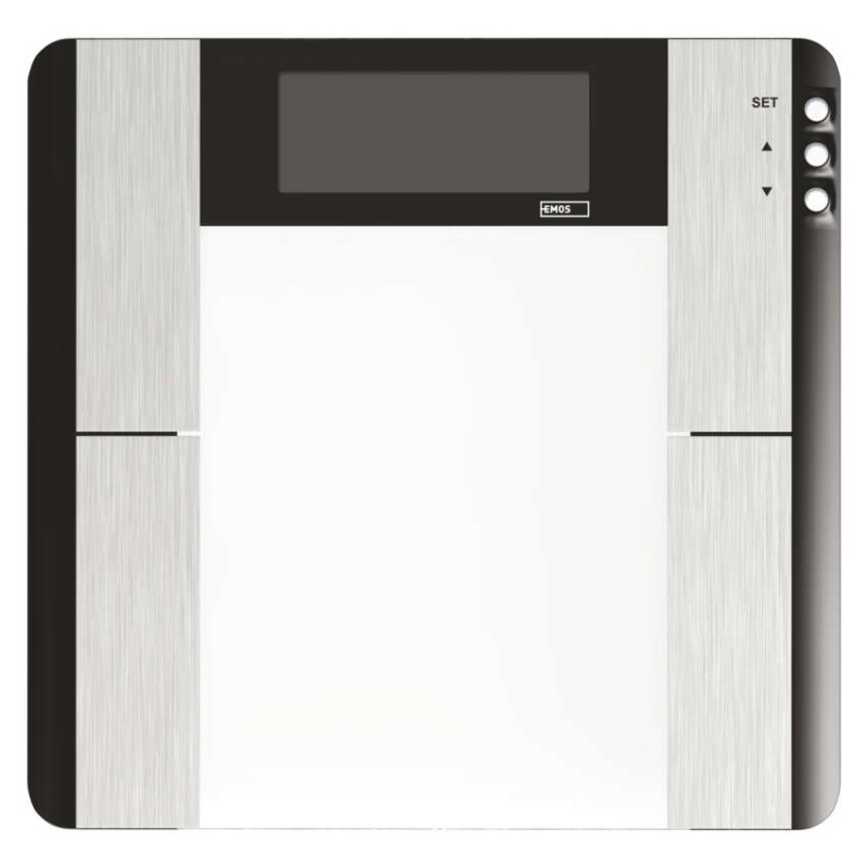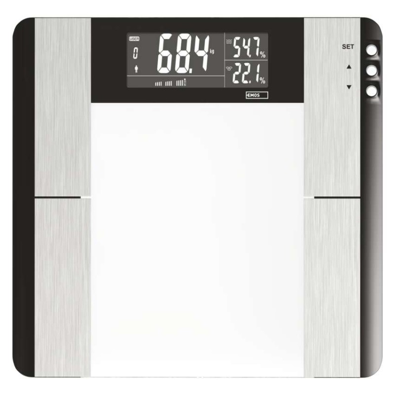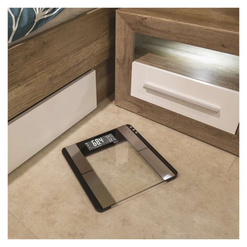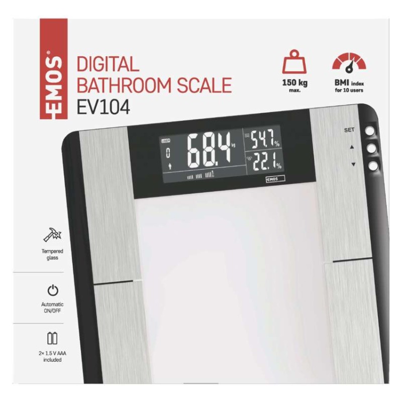 Digitálna osobná váha s výpočtom BMI indexu (množstvo tuku, vody a svalovej hmoty v tele).Pamäť pre 10 užívateľov.Elegantný slim design, vážiaca plocha z bezpečnostného skla (6mm), podsvietený displej s bielymi číslicami.Váživosť do 150 kg, možnosť prepnutia jednotky váženia.