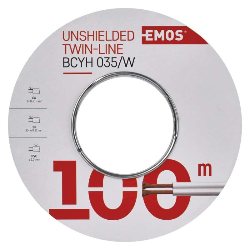 Netienená dvojlinka (vodič) s prierezom 2 × 0,15 mm2. Dvojlinka má bielu farbu a PVC plášť.