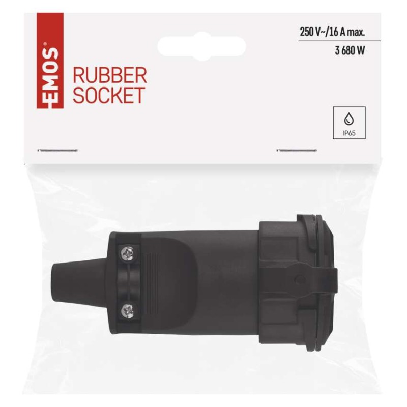 Gumová zásuvka pre pohyblivý predlžovací prívod. Je určená na pripojenie elektrických zariadení kde je vyžadovaný vyšší stupeň krytia (aj v exteriéri).