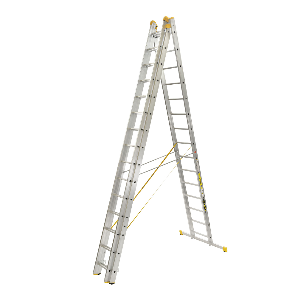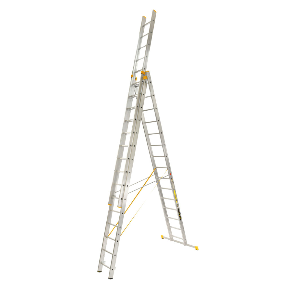 Trojdielny hliníkový univerzálny rebrík FORTE, počet priečok 3 x 15, max. výsuvná dĺžka 10,90 m a šírka 492 mm. *Tretiu výsuvnú časť NEMOŽNO oddeliť a používať ako samostatný diel. Možnosť použitia na profesionálne účely. Na produkt sa vzťahuje záruka 7 rokov.