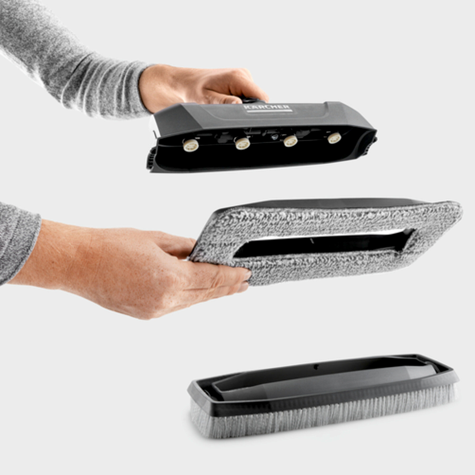 Rovnomerné a vysoko efektívne čistenie: štyri vysokotlakové trysky eliminujú odolné nečistoty na rôznych povrchoch. V závislosti od použitia je možné vymeniteľný rám ľahko a rýchlo vymeniť. Rám so štetinami na čistenie fasád a stien chráni používateľa pred striekajúcou vodou a dá sa s ním tiež jemne pohybovať po povrchu. Na čistenie sklenených povrchov, napríklad zimných záhrad, sa dokonale hodí rám s podložkou z mikrovlákna, ktorý je pripevnený suchým zipsom. Abrazívne vlákna podporujú odstraňovanie nečistôt a zaručujú jemné čistenie povrchov.
