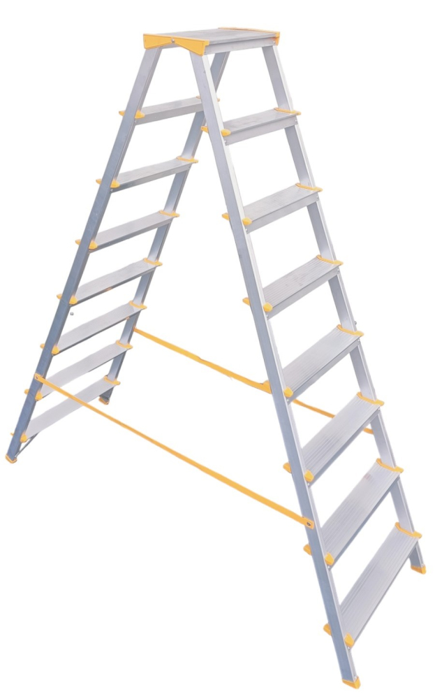 Hliníkové obojstranné schodíky EUROSTYL s integrovaným pántom horných nášľapov, kde nevzniká medzi nimi prázdna medzera, počet nášľapov 2x8 maximálna výška 1,62 m a maximálna šírka schodíka 527 mm. Možnosť použitia na domáce účely.