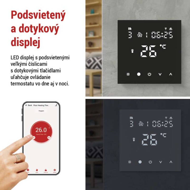 programovateľný elektronický izbový termostat, možnosť ovládania cez mobil (iOS, Android) |