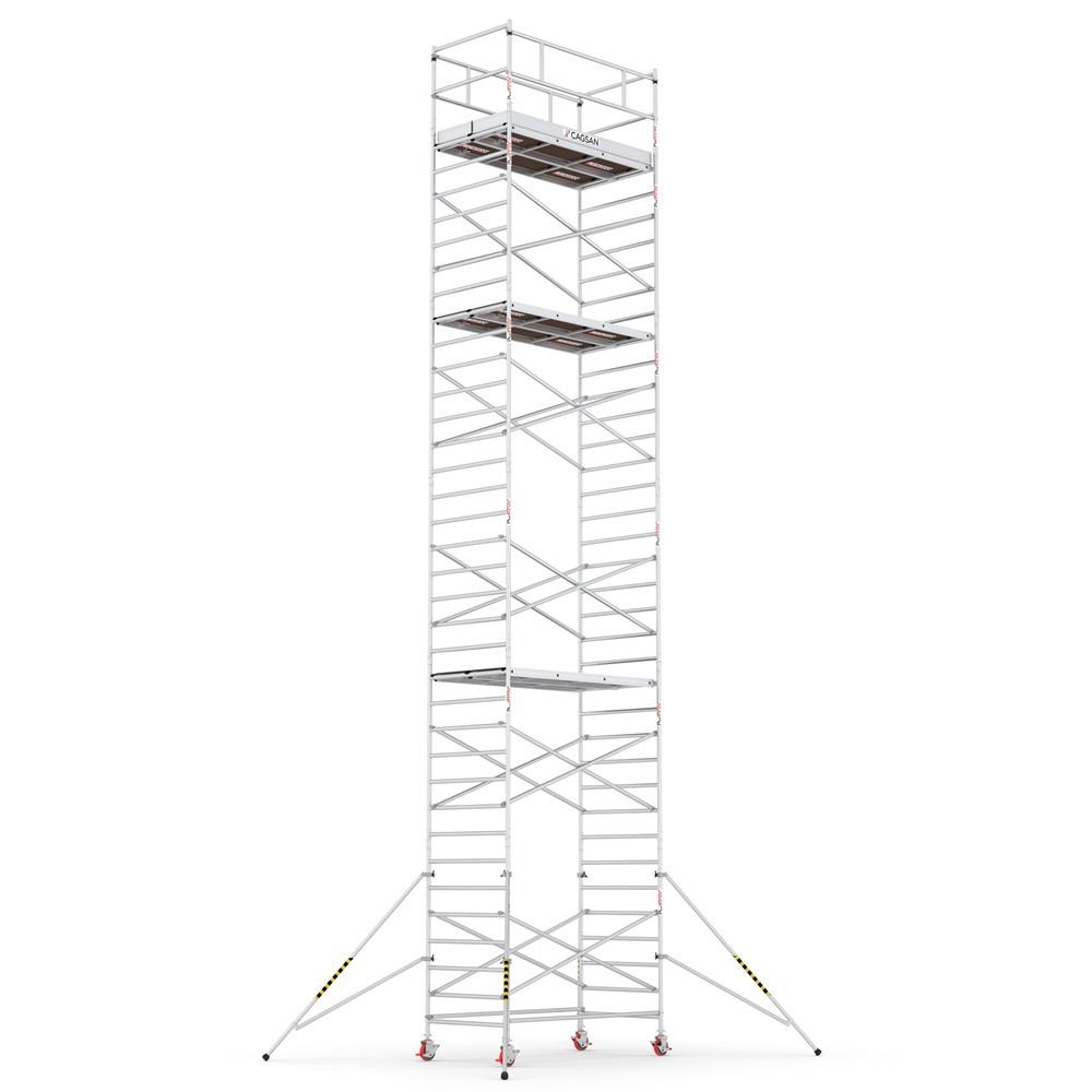 Profesionálne hliníkové lešenie zložené z viacerých modulov, ktoré umožňujú jeho nastavenie do pracovnej výšky max 12,7 m. Jednoduchý a rýchly zaisťovací systém. Jednoduché a rýchle zaistenie stabilizačných vzpier. Kolieska s aretáciou výškovo nastaviteľné až do 20 cm. Hmotnosť lešenia: 336 kg..