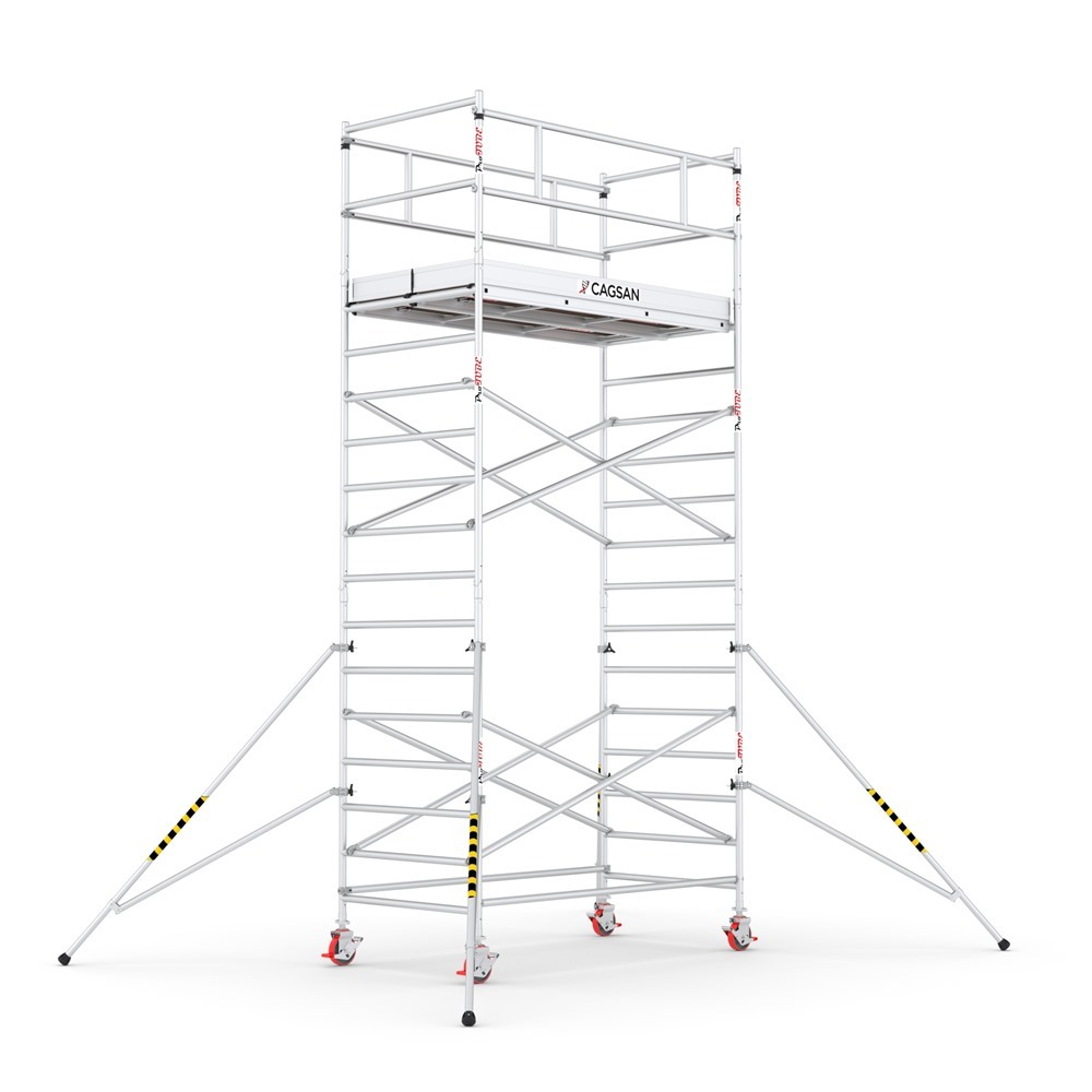 Profesionálne hliníkové lešenie zložené z viacerých modulov, ktoré umožňujú jeho nastavenie do pracovnej výšky max 6,4 m. Jednoduchý a rýchly zaisťovací systém. Jednoduché a rýchle zaistenie stabilizačných vzpier. Kolieska s aretáciou výškovo nastaviteľné až do 20 cm. Hmotnosť lešenia: 169 kg.