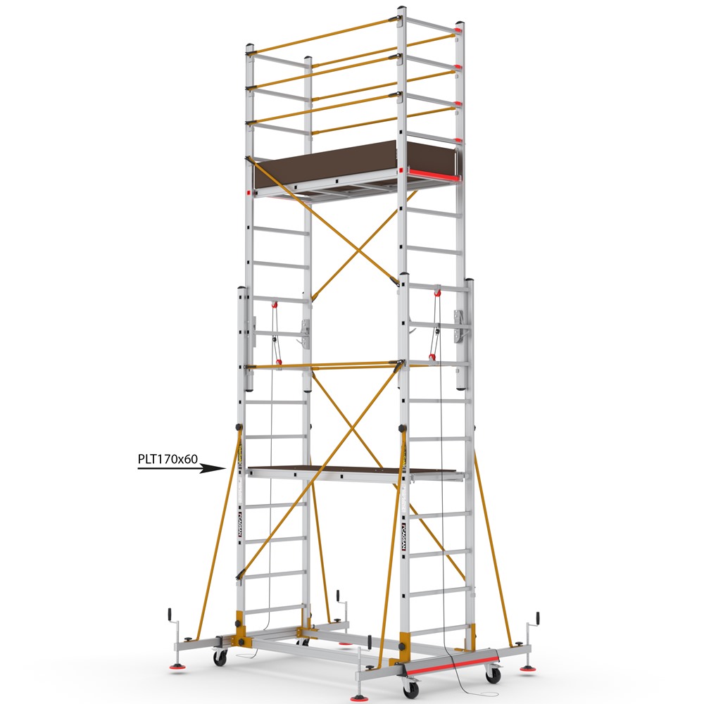Profesionálne, ľahko prestaviteľné dvojdielne teleskopické hliníkové lešenie ovládané lanami, ktoré umožňujú nastavenie lešenia do pracovnej výšky do 5,83 m. Na obsluhu lešenia stačia 2 osoby. TeleSafe ponúka flexibilitu použitia vďaka špeciálnemu kĺbovému systému a nastaviteľnej dĺžke. Pevná hliníková konštrukcia a oceľové podpery tvoria bezpečnú a odolnú konštrukciu.Pre rýchlu inštaláciu lešenia sa používa systém upínania Q-Lock. Výšku plošiny a lešenia je možné jednoducho nastaviť vďaka lanovému a kladkovému systému. Kryty plošiny a zábradlia sa otvárajú z vnútra, čím vytvárajú bezpečné pracovné prostredie. Má praktickú a prenosnú konštrukciu pre mobylné použitie.Uzamykateľné kolieska a oceľové podpery minimalizujú možné otrasy. Video ukážku lešenia TeleSafe XLN nájdete na tomto odkaze: https://www.youtube.com/watch?v=csk4mvdAOLg
