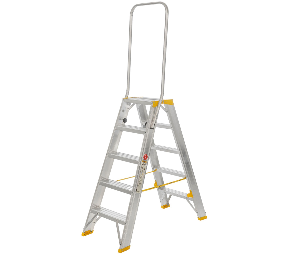Obojstranné hliníkové schodíky so sklápateľným madlom FORTE, počet nášľapov 2 x 5, výška 1,07 m a šírka 474 mm. Možnosť použitia na profesionálne účely. Na produkt sa vzťahuje záruka 7 rokov.