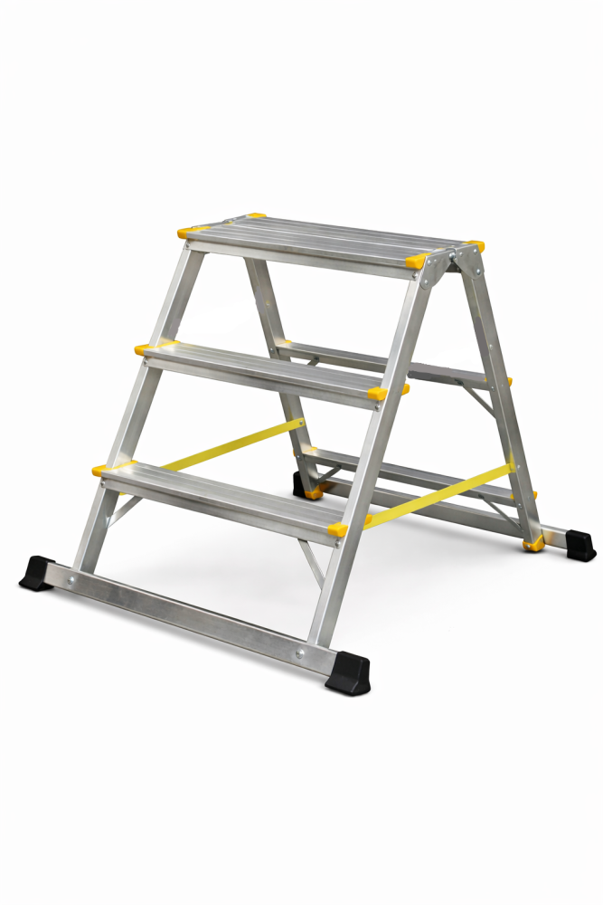 Schodíky obojstranné hliníkové so stabilizátorom, určené na používání na nezpevnenom povrchu, vhodné na použitie v záhradach a sadoch. Protisklzové, široké a bezpečné nášľapy. Počet nášlapov 2x3 až 2x8, max. výška 0,61 až 1,68 m a šírka 650 až 700 mm.Možnosť použitia na domáce účely.
