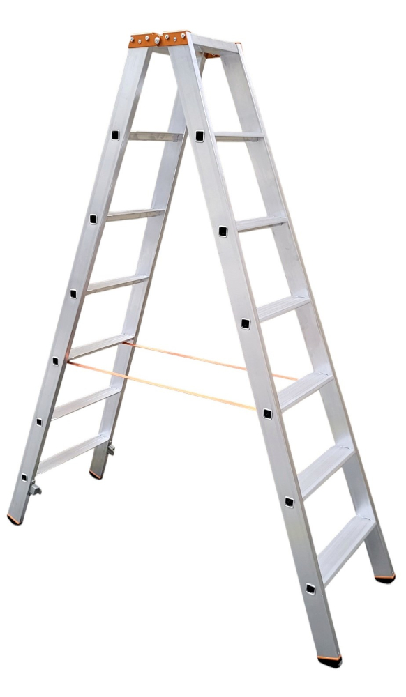 Obojstranné hliníkové schodíky PREMIUM, počet nášľapov 2 x 7. Maximálna výška 1.98 m. Možnosť použitia na profesionálne účely. Na produkt sa vzťahuje záruka 7 rokov.