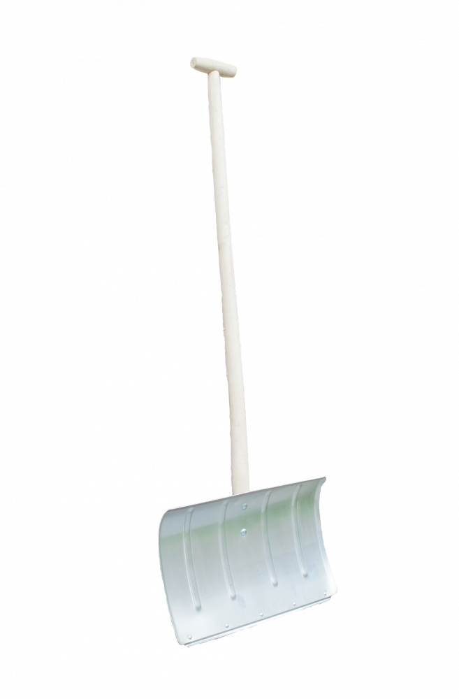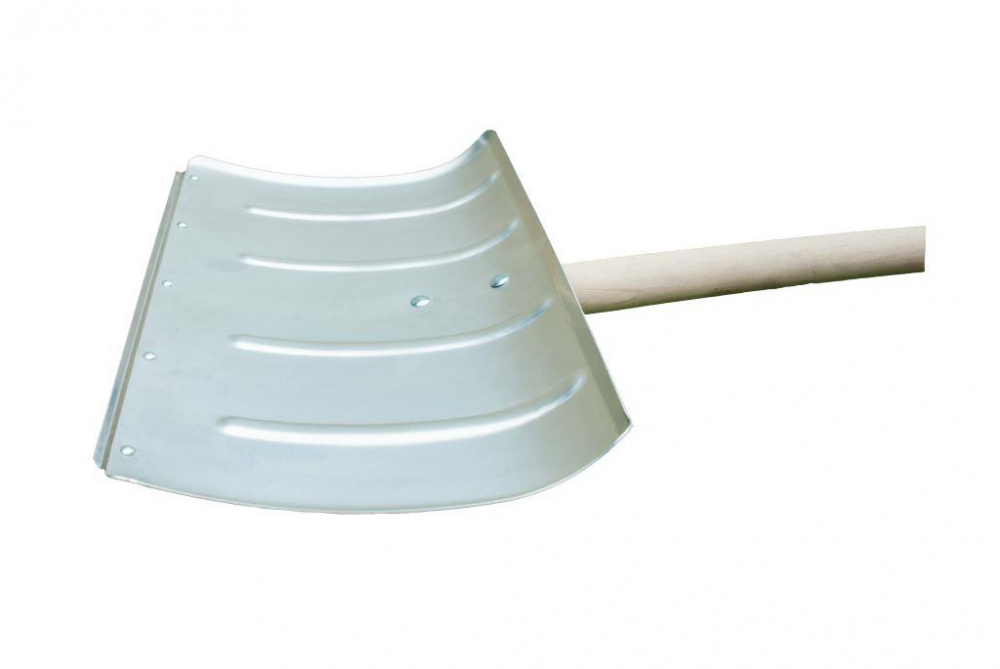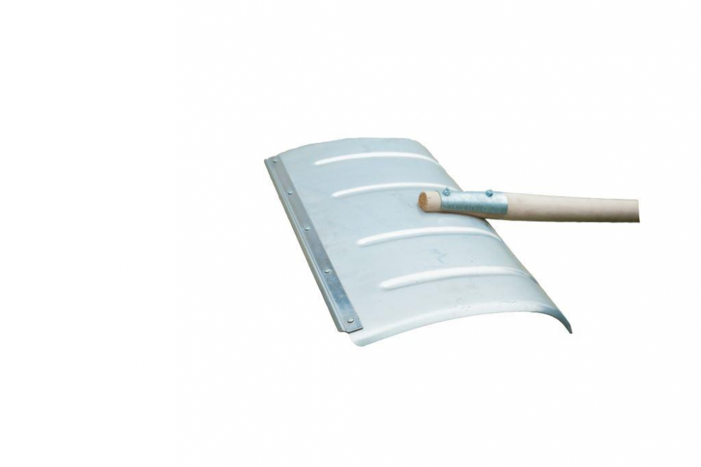 Hliníkový zhrňovač na sneh s drevenou násadou.